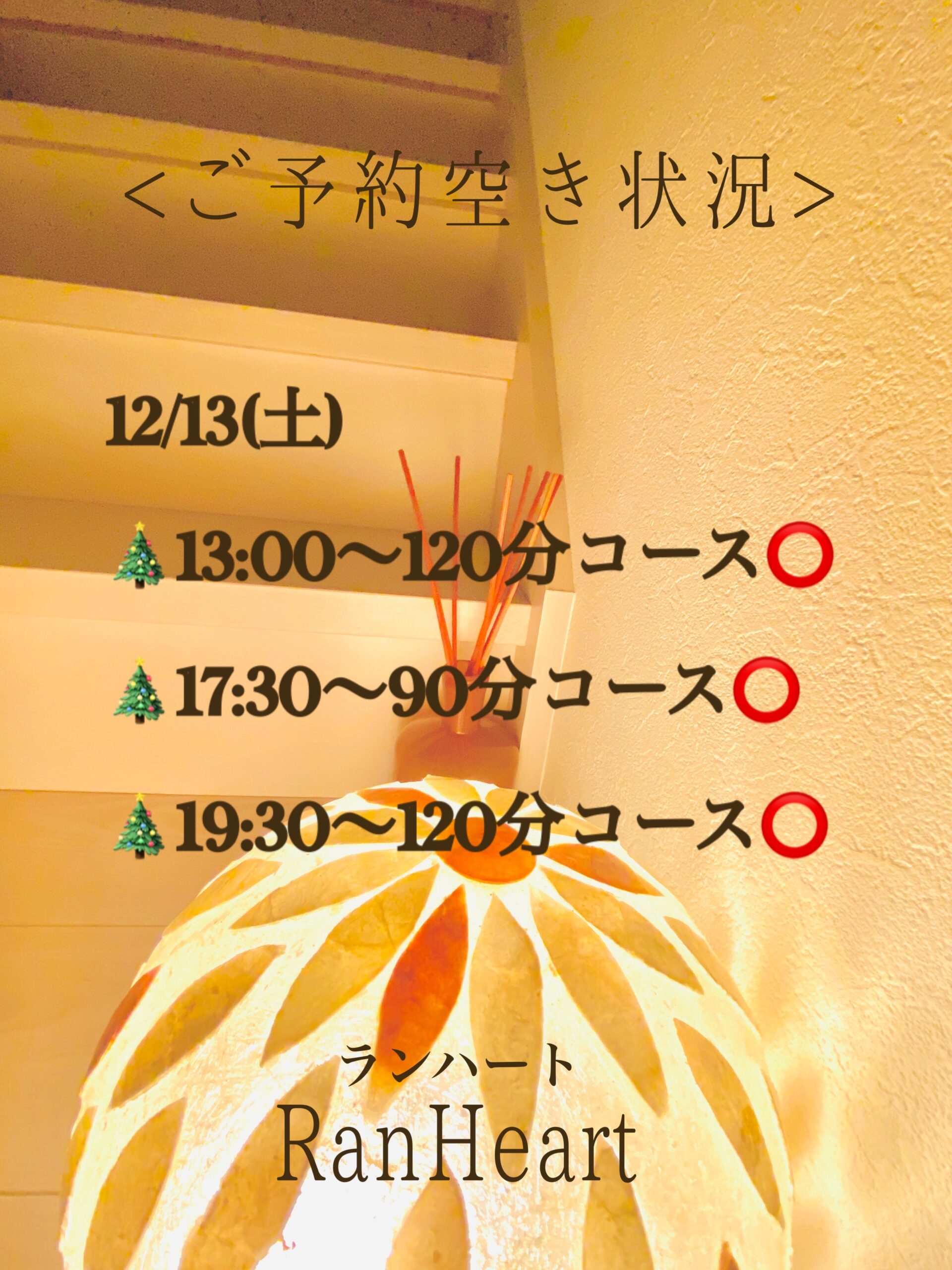 13日(土)<ご予約空き状況>13:00~120分◎17:30~90分◎19:30~120分◎